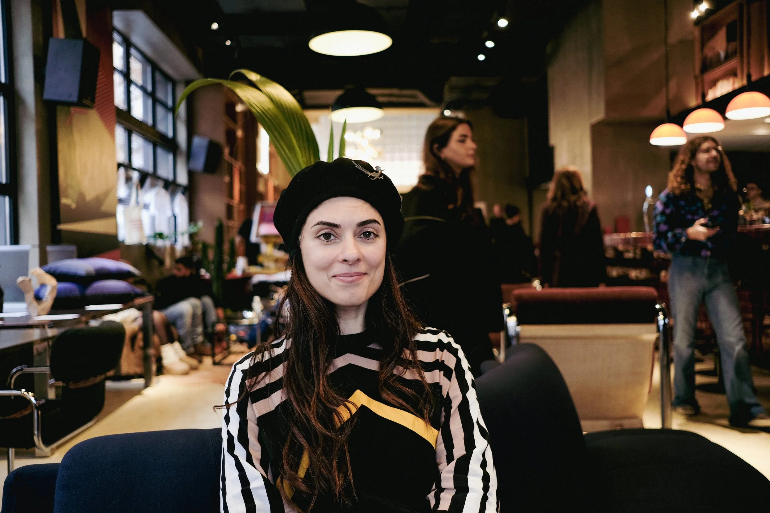 A woman with long dark hair, wearing a black beret and a black and white striped shirt with a yellow design, sitting in a modern indoor setting with other people in the background.
