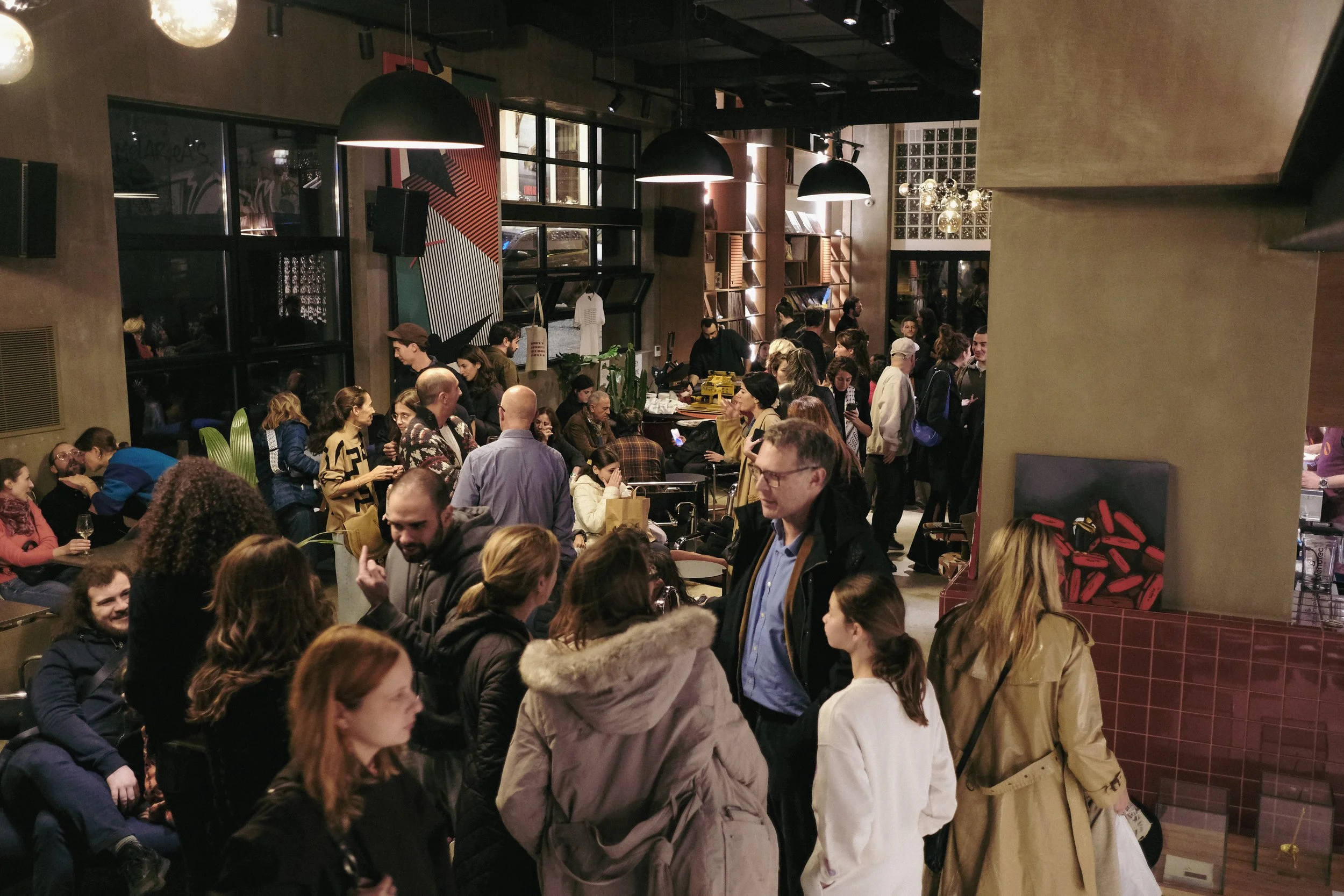 Crowd of people socializing in a cozy indoor venue, some sitting, some standing, with drinks in hand, warm lighting, and casual attire.