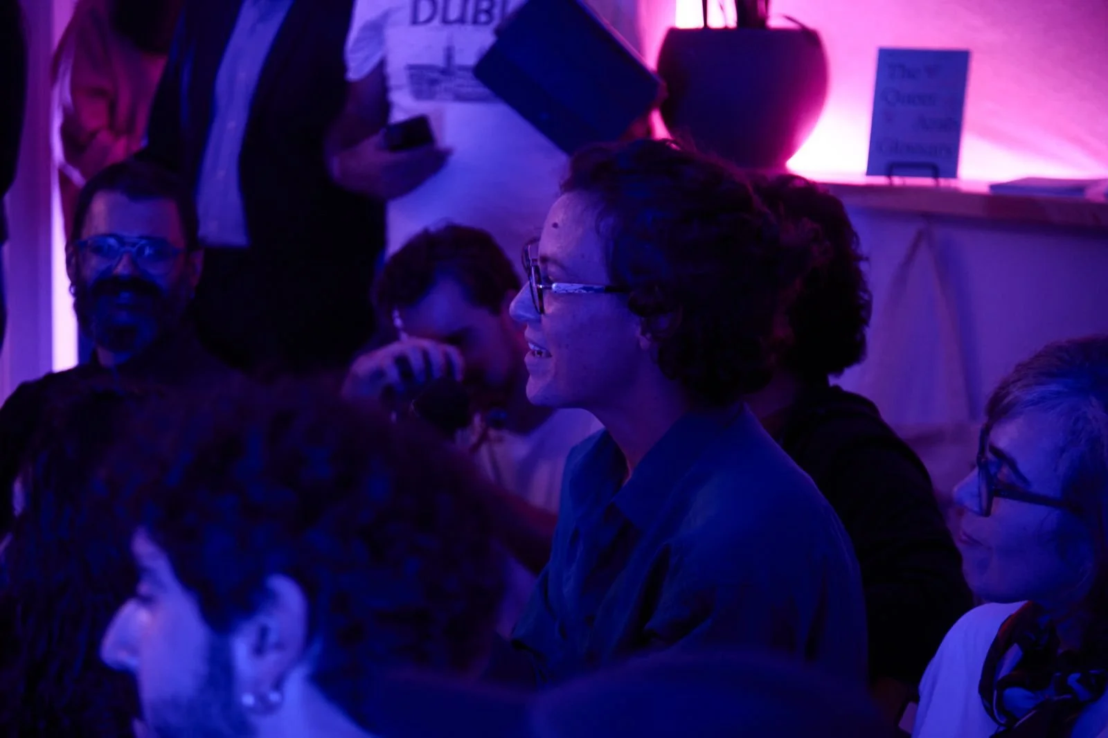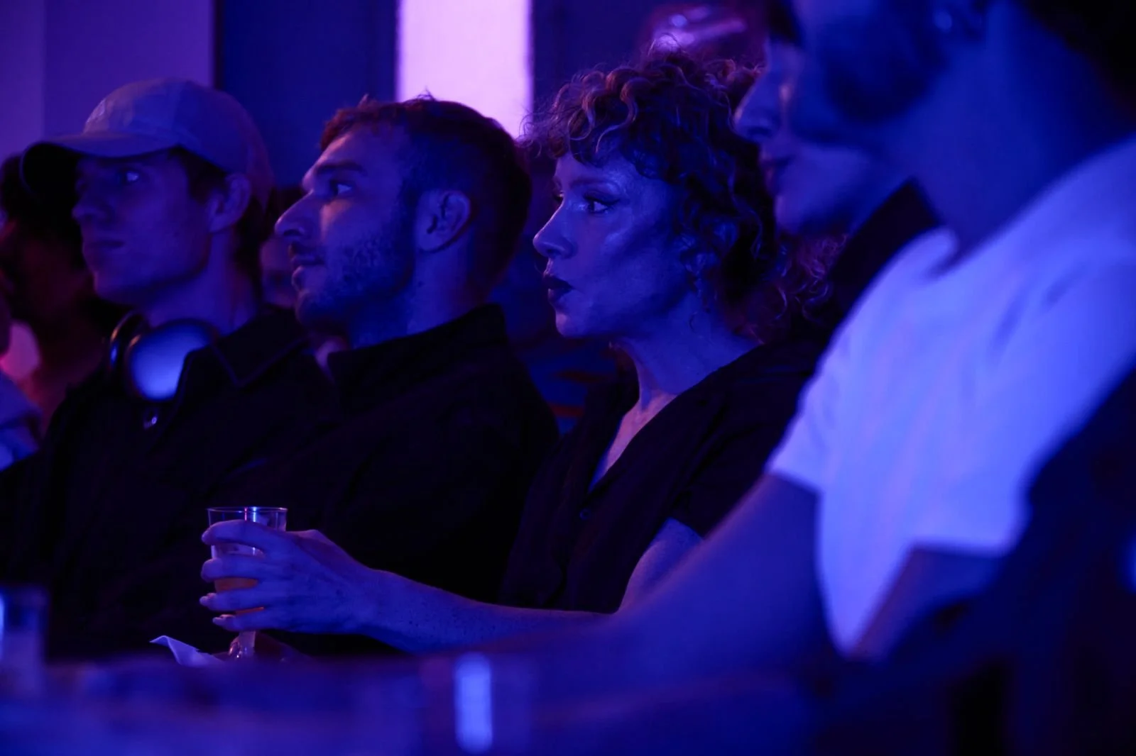 People seated in a dark, purple-lit room, with a woman with curly hair in the center holding a glass, attentively watching an event.