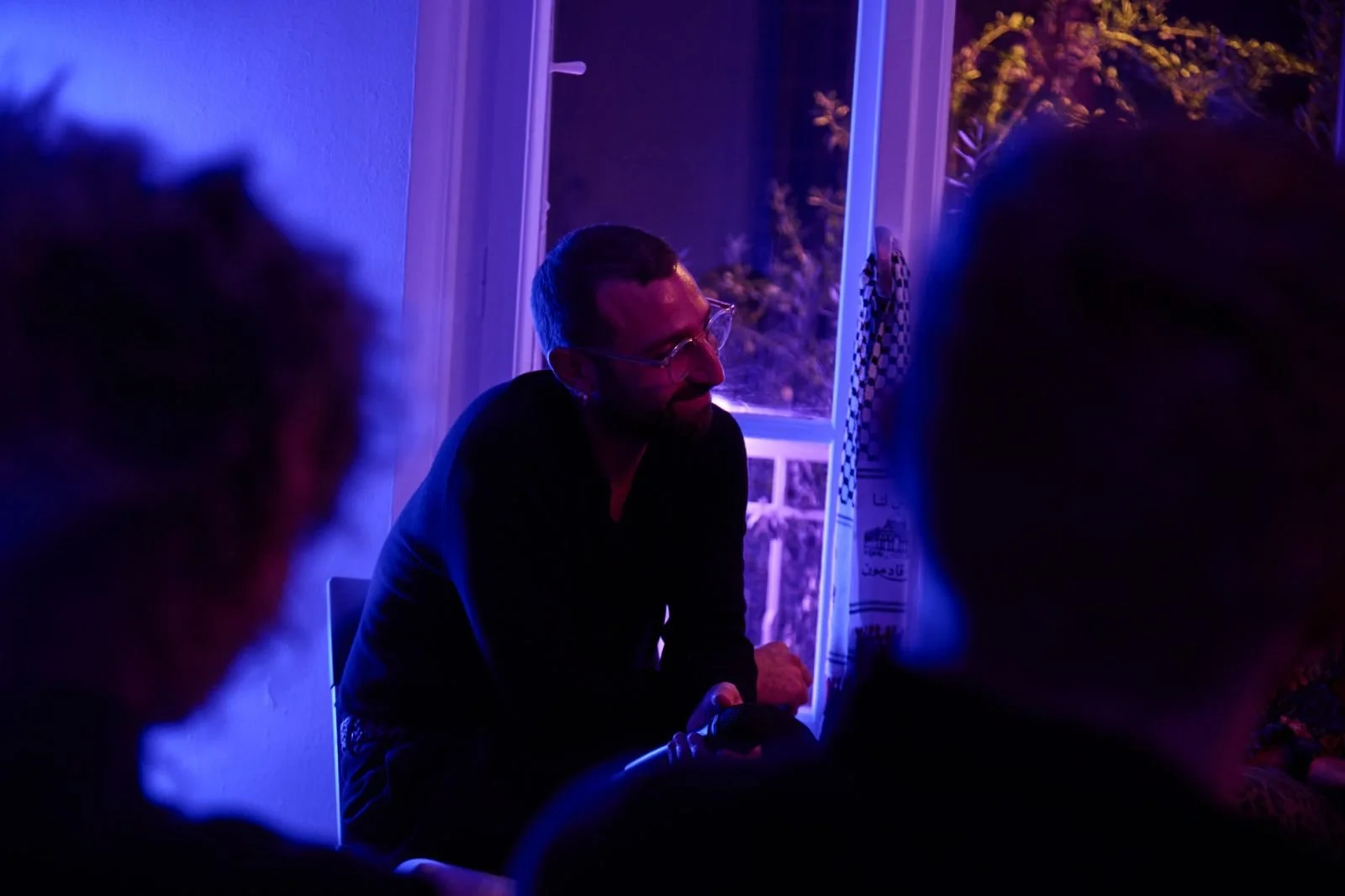 A man with glasses and a beard sitting by a window, illuminated by purple and blue lights, with two blurred people in the foreground.