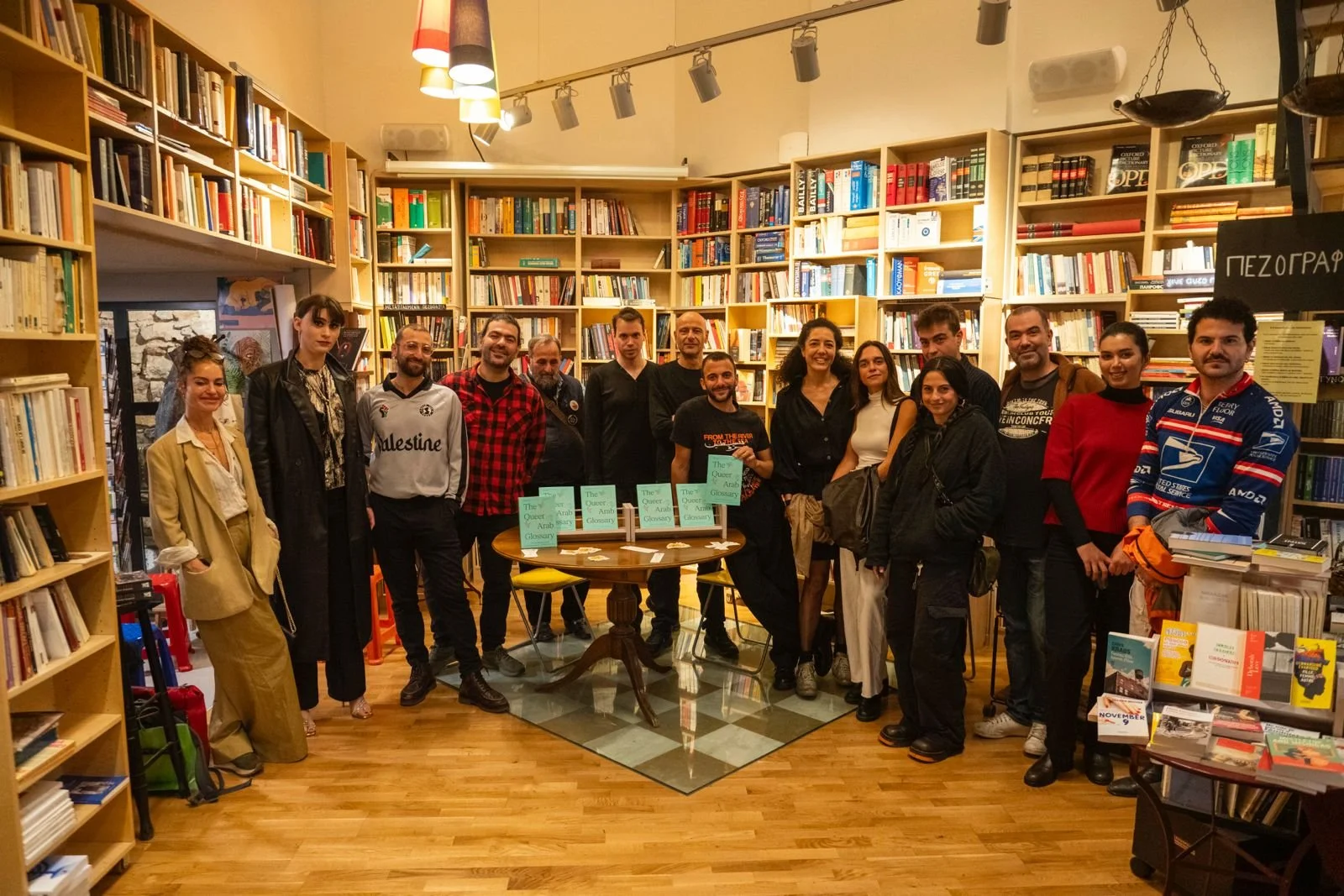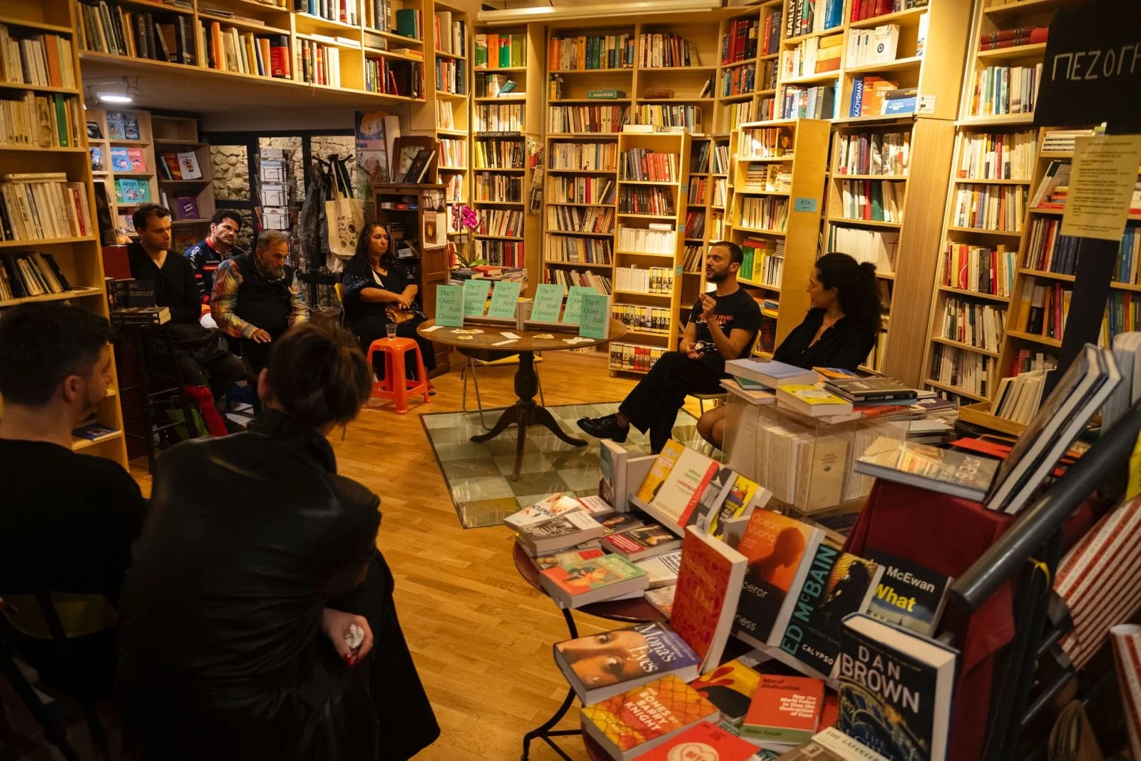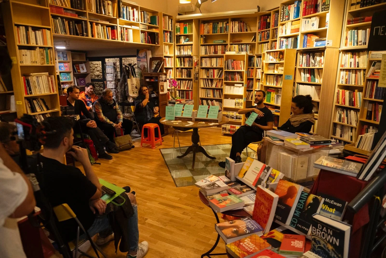 A group of people attending a presentation or discussion inside a bookstore or library, with bookshelves filled with books surrounding them.