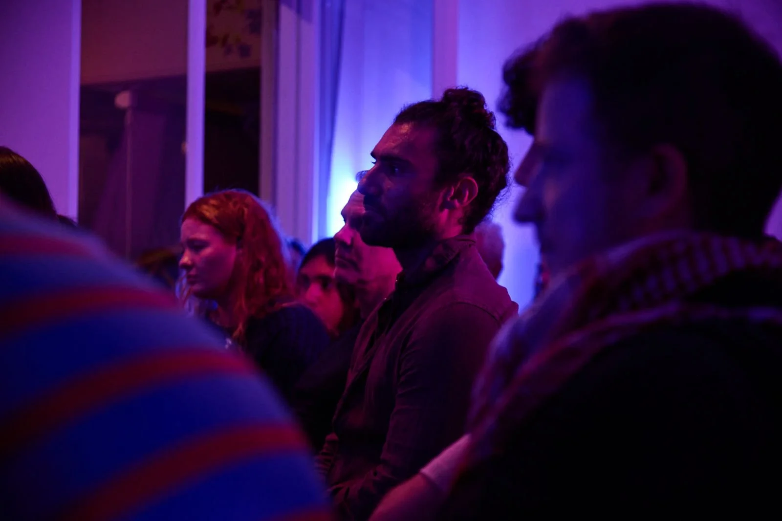 People listening attentively at an indoor event with purple and blue lighting.