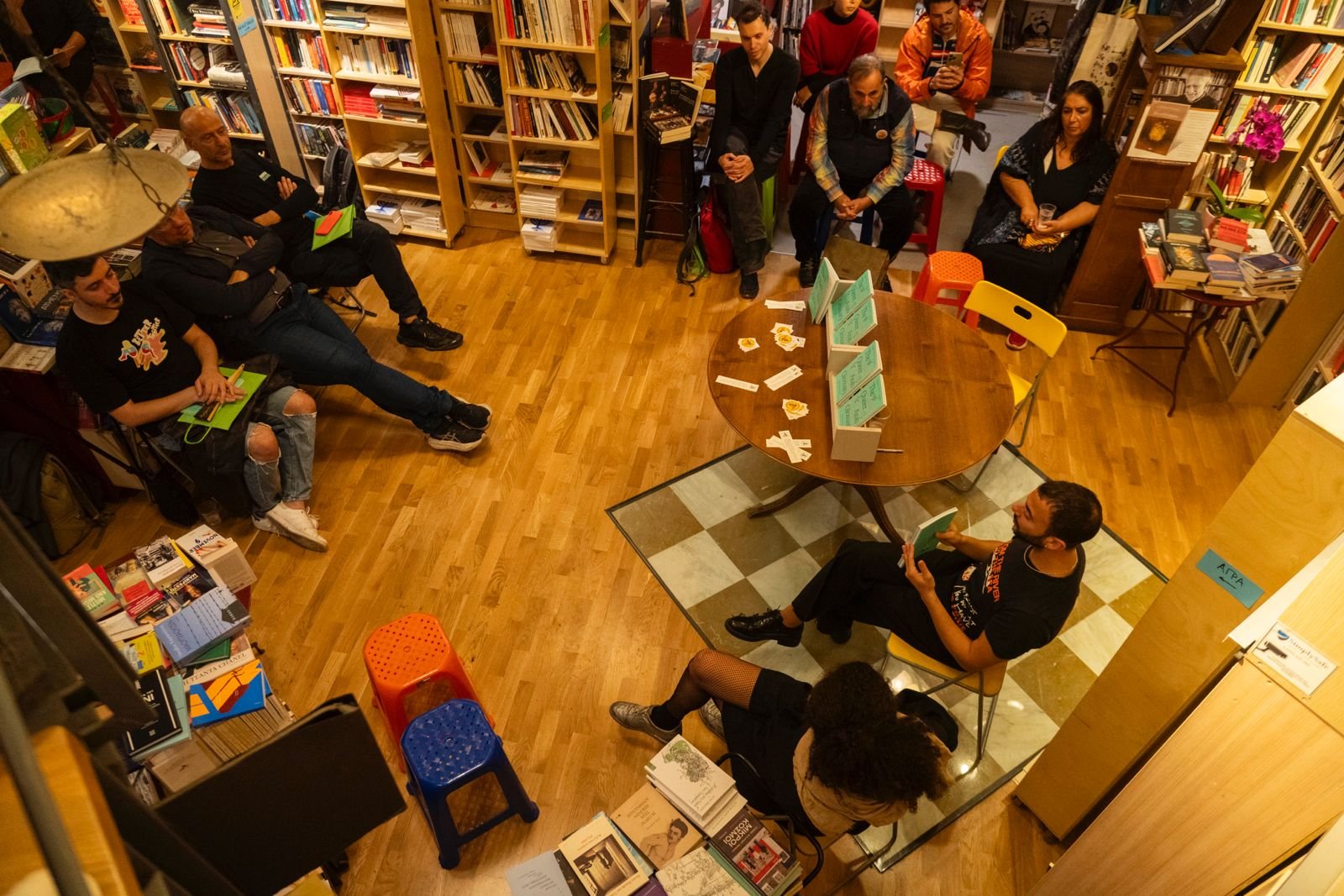 A person is sitting at a round table reading a book in a bookstore or library, with an audience seated nearby listening. The setting has bookshelves filled with books, and the audience and speaker are engaged, indicating a book reading or discussion