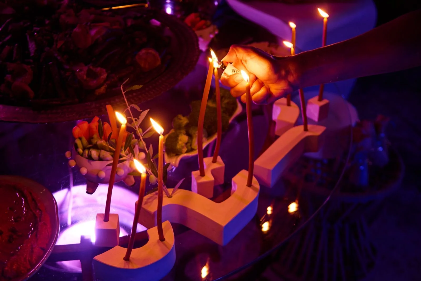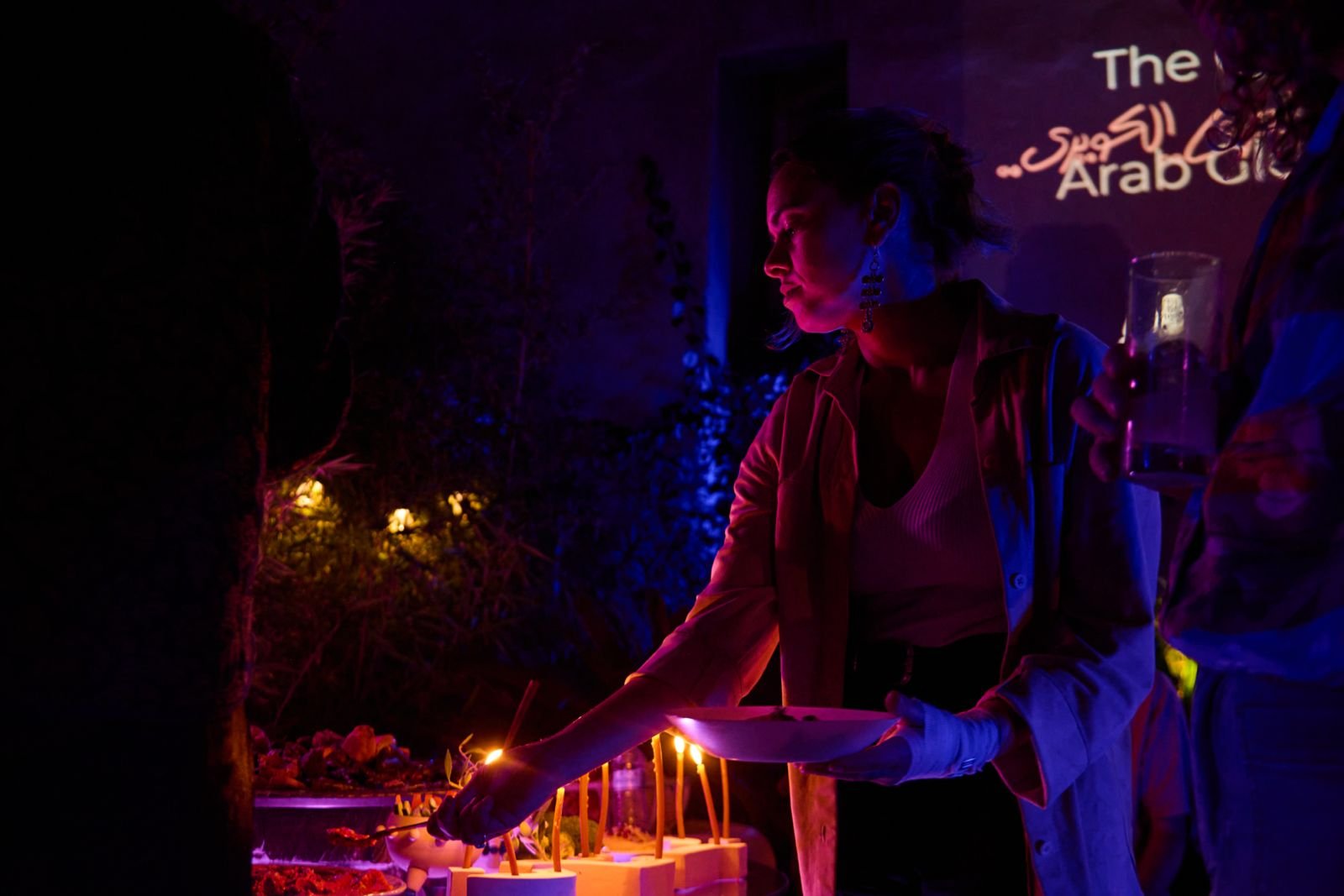 Woman lighting candles or lanterns at a nighttime event, with other person holding a glass of water nearby, and a sign in the background reading 'The ArabG'.