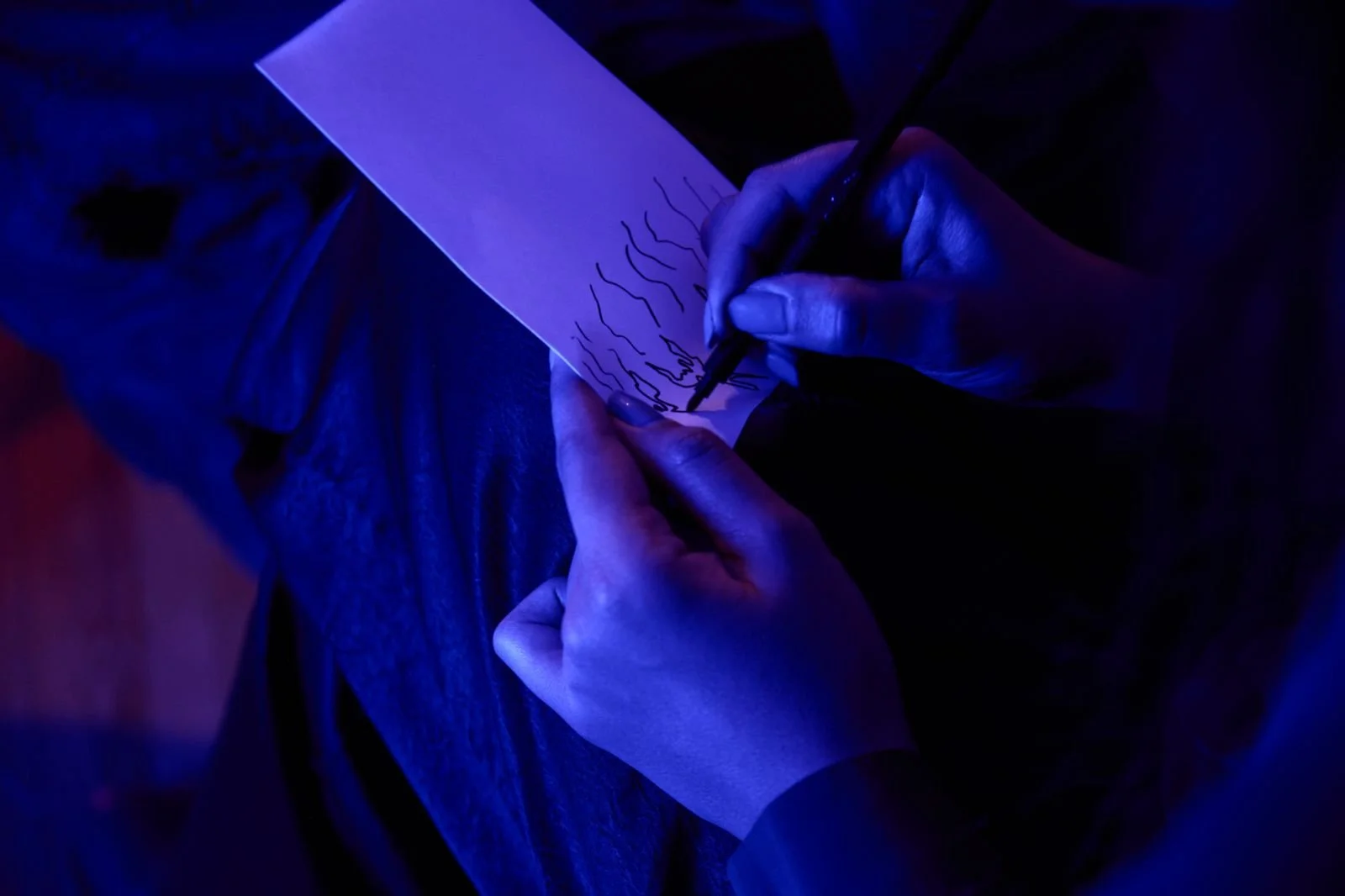 Person drawing on a small piece of paper with a brush, illuminated by blue and purple lighting.