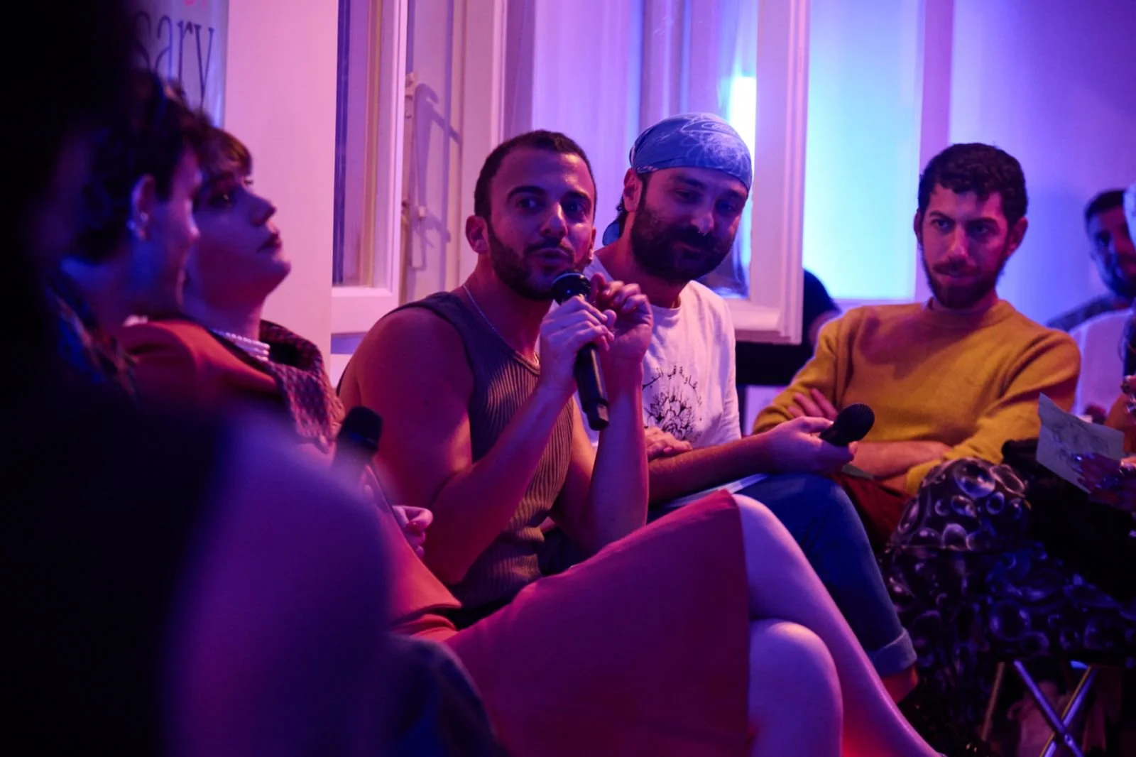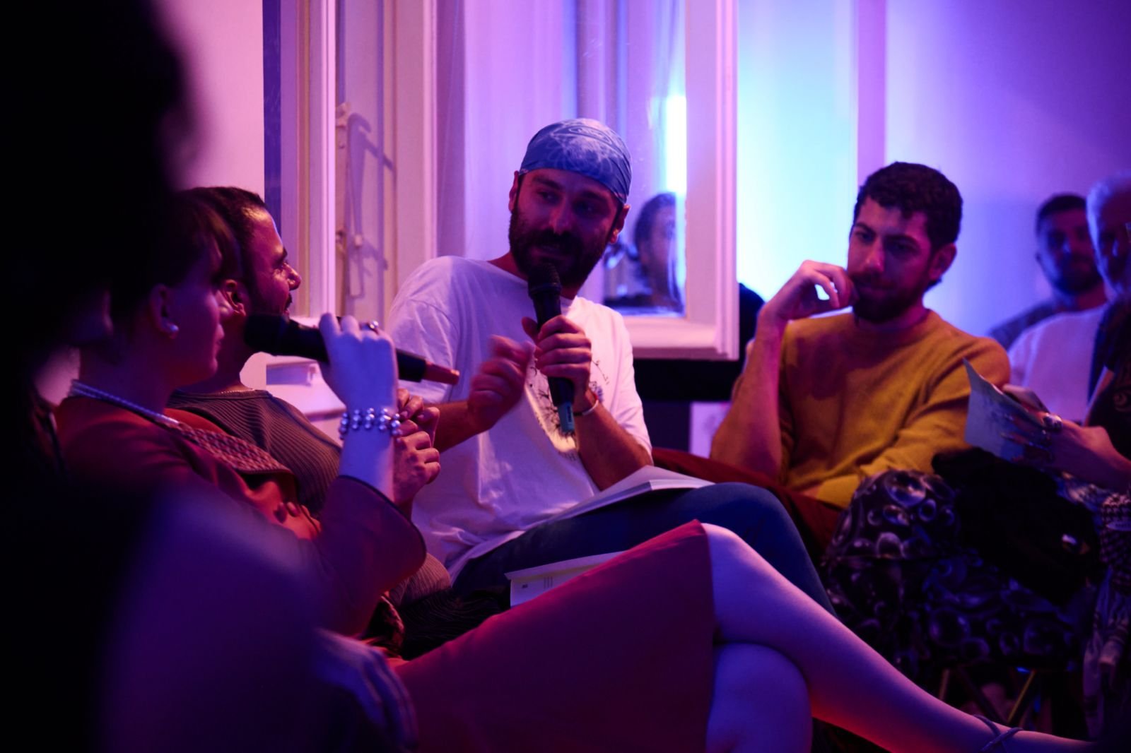 Group of people sitting in a room with purple and blue lighting, engaging in a discussion with one person holding a microphone, others listening and looking at each other.
