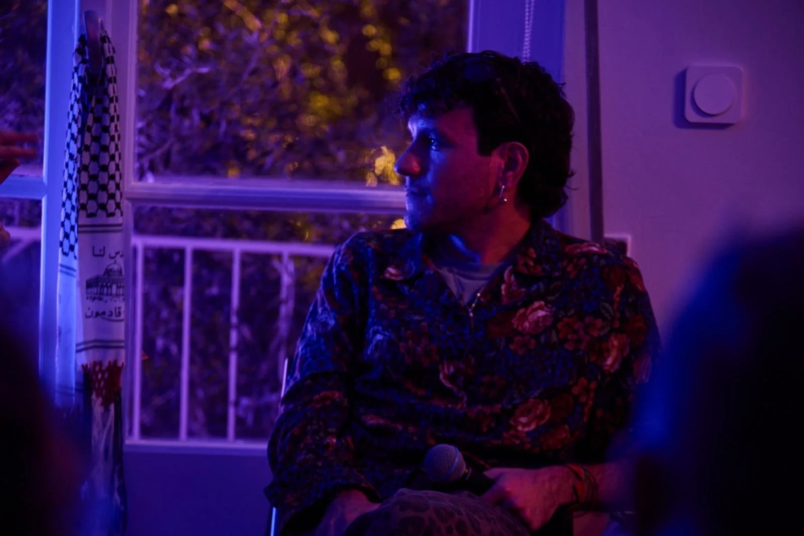 A person with short dark curly hair, wearing earrings and a floral shirt, sitting in a dimly lit room with purple and blue lighting, holding a microphone. There is a window with a checkered scarf hanging and outdoor trees visible through it.