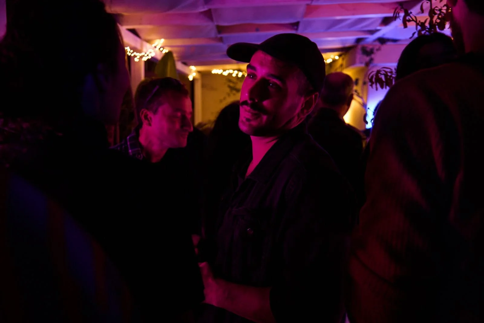 Group of people socializing in dimly lit room with string lights and purple lighting.