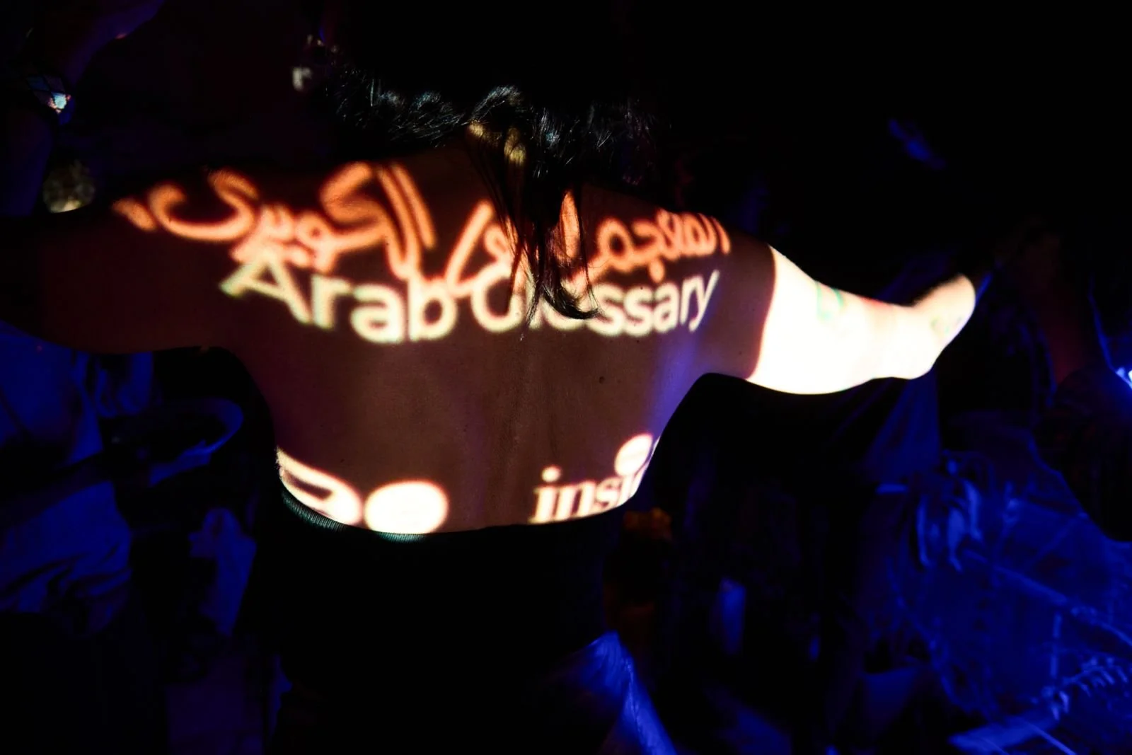 Person with shoulder-length dark hair in a dark setting, with words like 'Arabic', 'dictionary', and 'art' projected on their back.