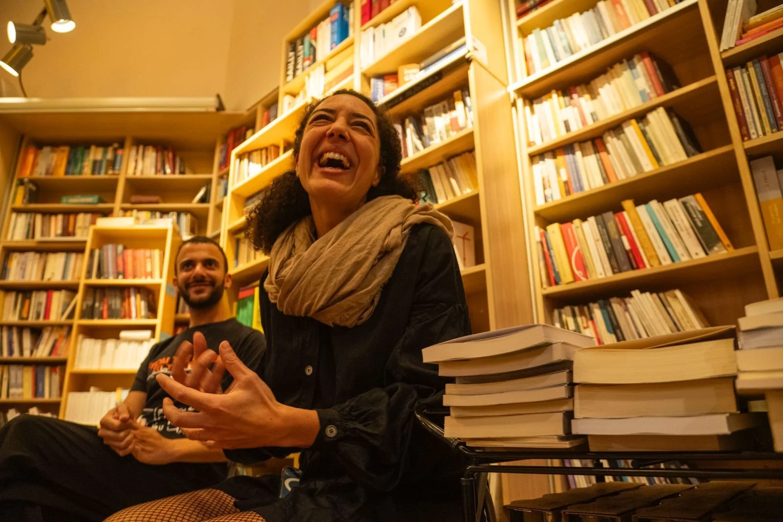 Two people, one woman laughing with her hands clasped, and a man smiling, are seated in a bookstore with wooden shelves filled with books behind them. There are stacks of books on a nearby table.