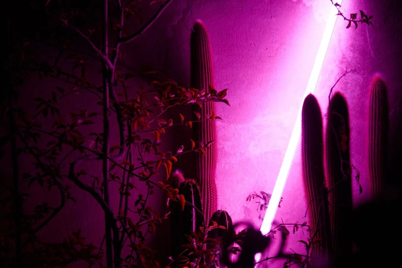 Pink neon light illuminating a wall with cacti and plant shadows.